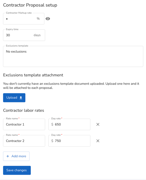 Here is where you find your contractor proposal setup, including your company’s markup rate, expiry time, exclusions and contractor labor rates.
